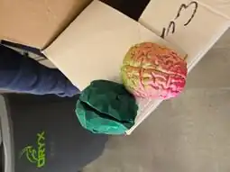 The squishy 3D print section, pictured in Figure 1-G, was 3D printed with TPU (thermoplastic polyurethane) material. The stl file of the front quarter of the left hemisphere was used for the prints. Before starting trials of the full brain section, 10 tester cubes were printed to test different types of infill patterns, and the "honeycomb" infill was tested by printing a small slice of the brain section. The tests went successfully. The first trial for a final piece used 85A TPU filament with 5% "honeycomb" infill and came out feeling almost hollow and very flimsy. The 2nd trial used a different 3D printer which can print support material that can be dissolved afterwards, theoretically leading to smoother surfaces. However, possibly because of poor choices in settings, this print came out looking very poor with loose filament strands. The 3rd trial went back to the original type of printer, used for all final pieces, and was printed using 95A TPU filament with 20% infill. This came out much harder and more durable, but still slightly squishy, and was used as the final piece for this section. Time ran out to complete a 4th trial, which would have involved either the 85A TPU with more than 5% infill or the 95A filament with less than 20% infill. The final piece had a lot of support material on the surface which took about 2 hours to remove, using small knives. A smoother surface could have been achieved by outsourcing the print to a professional 3D printing company, but Team ID felt that it was more meaningful to make the section themselves, thus tying in with the objective of displaying CPU culture and the students hands-on abilities.