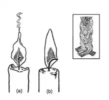 The type of wick originally used in candlemaking was made of bleached twisted cotton yarn (Figure 1 a). On burning, it stood upright in the centre of the flame (which is cool) and was therefore unable to burn away cleanly. The result was a very smoky flame, providing only dim light and requiring frequent snuffing. The wick used in modern candles is made of plaited or braided cotton (Figure 1 insert), resulting in a uniform wick which curls as it burns. The curling brings the end of the wick into the hottest part of the flame where it is able to burn away cleanly and thus provides a bright flame, with no need for snuffing (Figure 1 b).
