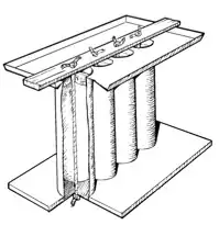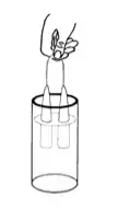 The equipment used for dipping can range from a stick from which the wicks are suspended to an elaborate, commercially made machine. At the very simplest level, dipping may be carried out by holding the centre of a wick in one hand and dipping it repeatedly into molten wax so that a pair of candles is produced (Figure 2). Although this approach results in a very low rate of production, it is the principle on which all dipping machinery is based. In the dipping process, a number of wicks are suspended and repeatedly dipped into molten wax, successive layers being built up to form the finished candle. Excess wax drains off, but some remains at the lower end which is therefore thicker. Although it is possible to produce uniform candles using this method by discarding the lower 10cm or so, this is wasteful in terms of heat applied and wick used unless the tapered section may also be used as a candle. It may therefore be preferable to use a different technique (such as moulding) if it is necessary to produce only uniform candles.