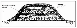 Charcoal is produced in a kiln or pit. A typical traditional earth kiln (see image 1) will comprise the fuel to be carbonised, which is stacked in a pile and covered with a layer of leaves and earth. Once the combustion process is underway the kiln is sealed, and then only once process is complete and cooling has taken place can the charcoal be removed.