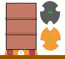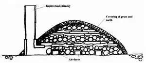 The traditional method in Britain used a clamp which is itself already a relatively advanced yet locally-constructable kiln. This is essentially a pile of wooden logs (e.g. seasoned oak) leaning against a chimney (logs are placed in a circle). The chimney consists of 4 wooden stakes held up by some rope. The logs are completely covered with soil & straw allowing no air to enter. It has to be lit by introducing some burning fuel into the chimney; the logs burn very slowly (cold fire) and transform into charcoal in a period of 5 days burning. If the soil covering gets torn (cracked) due to the fire, additional soil is placed on the cracks. Once the burn is complete, the chimney is plugged to prevent air to enter.[3] Modern methods use a sealed metal container, as this does not have to be watched lest fire break through the covering.