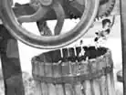 To describe it briefly, it stands on four legs, is about three feet long, one and a half feet wide and about four feet high. On one end is a chute, or "hopper," into which the apples are poured. Under the hopper are gears which are turned by a crank operated by hand. These turning gears quickly transform the apple into pomace or ground up fruit which is caught in a slat located directly below the hopper.