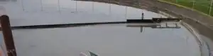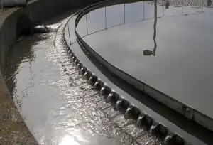 After spending 3.8 hours in the clarifier the effluent, water free of suspended solids, flows through a baffle and then through weirs at the edge of the tank. The baffle, which is essentially a wall partially submerged in the wastewater to prevent surface scum from flowing through the weirs with the effluent. The weirs, which have notches cut into them at regular intervals around the entire edge of the tank, allows the effluent to flow out of the tank at a constant even flow.[2] Because the flow through the weirs is the same around the whole tank, the effluent and the wastewater still in the tank is not disturbed, minimizing mixing and an increase in turbidity. After the effluent passes through the weirs, it flows into the effluent pipe and is transported to the oxidation ponds for further treatment.