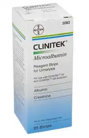 The CLINITEK microalbumin strip tests give an accurate reading of the albumin and creatine ratios in one minute. This device makes it possible to test for early kidney disease in patients with diabetes or hypertension because these strips have increased sensitivity detecting albumin levels as low as 20mg/dL. Early detection can lead to prompt treatment to prevent further kidney damage.