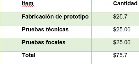 - Pruebas técnicas: Ya que está se llevará a cabo por los estudiantes se planea invertir solo en incentivos que llevarían un total de 25 dólares, $5 por prototipo.