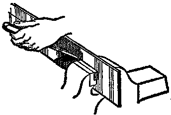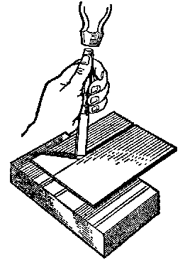 When used to cut sheet metal, the chisel must be held at a slight angle to the surface of the metal as shown in Figure 1. This is done so that when the chisel is struck by the hammer it moves along in a continuous line toward the worker as it cuts through the metal. If the chisel is held vertically, a separate cut is made each time the chisel is struck by the hammer, and the "line" then becomes a series of short cuts. A block of soft iron is generally used for support.