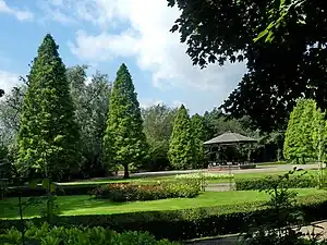 Each of the six towns in Stoke-on-Trent has at least one park. At nine hectares, Burslem Park is one of the largest registered Victorian parks in the UK.[45] Park Hall Country Park in Weston Coyney is a national nature reserve, and its sandstone canyons are a Site of Special Scientific Interest.[46] Hartshill Park in Stoke is also a nature reserve, and Bucknall Park is home to the City Farm. Westport Lake in Longport is the largest body of water in Stoke-on-Trent and has a nature reserve. Queens Park or Longton park in Dresden is one of the city's heritage parks and is famous for its horticulture and lakes. It houses several buildings including a clock tower and three bowling pavilions.