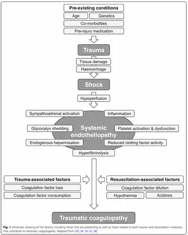 One-third of bleeding trauma patients show signs of coagulopathy on admission. These patients are at greater risk for multisystem organ failure and death than patients with other diseases or similar injury patterns in the absence of coagulopathy. Early acute coagulopathy associated with traumatic injury has recently been defined as a multifactor condition, based on hemorrhagic shock, thrombomodulin upregulation related to tissue damage, thrombin-thrombomodulin complex generation, and activation of anticoagulation and fibrinolytic pathways.[12] Other factors affecting the severity of clotting disorders include acidemia, hypothermia, dilution, hypoperfusion, and coagulation factor consumption. Additionally, coagulation dysfunction is further influenced by trauma-related factors (e.g. traumatic brain injury) and patient-related factors (e.g. age, comorbidities, genetic conditions, medications).