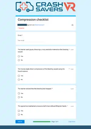 Based on the history and physical exam findings, the learner must choose the correct procedure for stopping the bleeding and provide the patient with the most appropriate next steps. The CrashSavers VR application is interactive and is designed to accommodate both novices and experienced medical professionals.