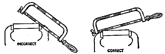 Much of the difficulty encountered in cutting metal is due to improper tension of the blade in the frame. The blade should be tightened in the frame so that it does not whip sideways when cutting. But it should not be made too tight, particularly when new, since there is then a great chance of breakage if the frame is slightly twisted when sawing.