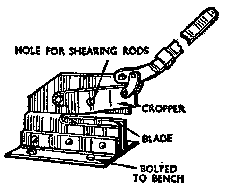 Care must be taken to keep the saw running true, otherwise the blade is very easily broken. The saw must not be forced, and slow, easy strokes are necessary. While metal saws work very well on small cutting jobs, sawing through a large section of sheet metal is tedious work. For large cutting jobs the home mechanic would do well to take the work, when possible, to a machine shop and let them cut the metal on a shearing machine, as shown in Fig. 5. This machine consists of a fixed blade and a cropper, operated by a long handle so as to obtain the advantage of a long lever. This machine will cut sheet metal of fairly heavy gauge in a fraction of the time it would take with a hacksaw.
