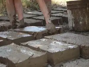 Fig: As drying time varies in different climates, an adobe is ready to be scraped and stacked when it can be scratched with a nail and does not scrape off easily. -