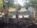 Fig 8: After the straw is mixed into the mud it must then be turned with shovels to mix it once again and then cut with a hoe into smaller piles which are ready to be brought to the brick making site. -