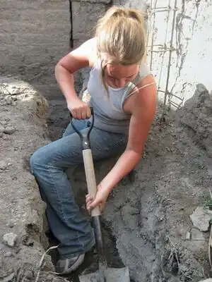 - Day 1 – We sorted adobes from the previous year into usable and unusable bricks. We broke up the unusable bricks with pickaxes to use to make new adobes, and saved half-bricks for construction of the walls. We moved dirt from digging up the foundation to the adobe-making site and made a "volcano" with the dirt and broken-up adobes by making a crater in the pile and filling it with water and wetting the whole pile for use the next day.