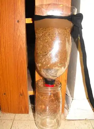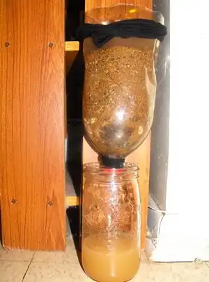 As source water is poured into the filter, it will trickle down through the sand and gravel and come out the neck of the bottle. As it moves through the filter, the fine particles in the sand pass through with the water, taking with them the particles in the source water. The initial effluent will therefore be very dark and turbid, as it contains both the initial turbid source water as well as fines from the filter media. From here, the effluent settles to produce a very clear supernatant. This will be poured directly into the third bottle - the clear PET plastic or glass container - with care taken to ensure that the settled particles do not transfer. This relatively clear water can then be treated with the solar disinfection method with increased effectiveness as compared to unfiltered, unsettled water.