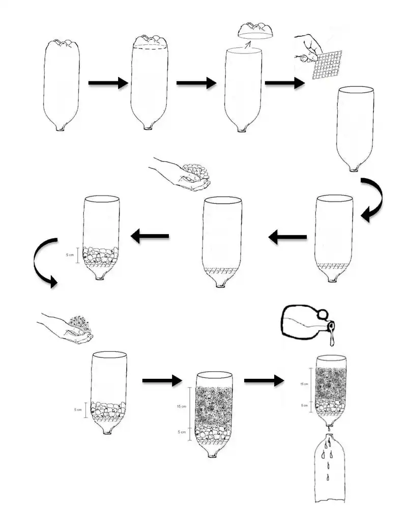 While the suggested design utilizes three plastic bottles, it is imperative that only one of these is a clear PET or glass bottle, or clear plastic bag. The other two containers (used to construct the filter and collect the filtrate) do not have to be plastic and in fact, any container of similar dimensions to what is suggested should be effective.