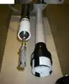 Bottom: the bearing assembly and generator. Top: bearing sleeve and generator case. The bottom assembly goes inside the top asssembly. -