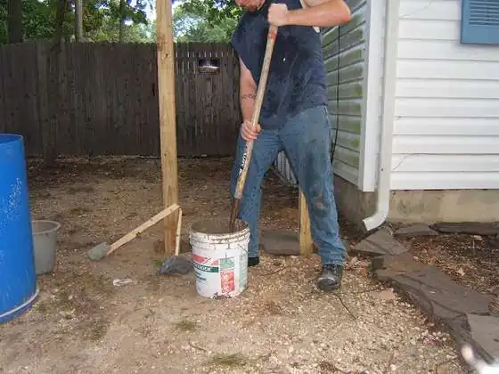 With the first post in the ground, I leveled it off with a level and propped it into place with scrap wood. Then, I began to mix the concrete. This entire project took three 50lb. bags of fast-drying concrete. With the concrete mixed to the right consistency, I poured it around the base of the post.