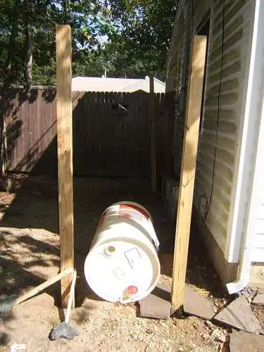 To begin, I laid out a 55 gallon drum on the ground and dug a hole on either side in the spot that the poles (4x4 pressure treated lumber posts) were going to go.