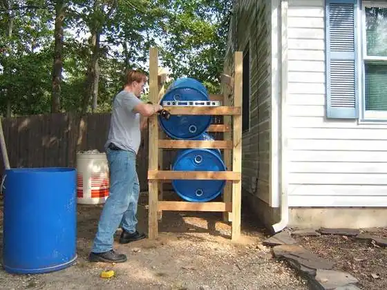- The bottom barrel would most likely benefit from a small hole drilled above the water line to let out air as it gets replaced with water. This will allow the top barrel to drain into the bottom barrel faster and at a more steady rate.