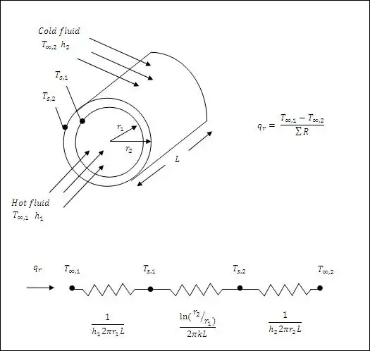 The following figure shows the equations and diagram for determining heat loss through a pipe of length L with inner diameter r1 and outer diameter r2 with conductive heat transfer coefficient of k containing a hot fluid with temperature Tinf1 and convective heat transfer coefficient of h1 surrounded by a cold fluid with temperature Tinf2 and convective heat transfer coefficient of h2. Ts1 and Ts2 refer to the surface temperatures of the pipe on the inner and outer diameters, respectively.[12]