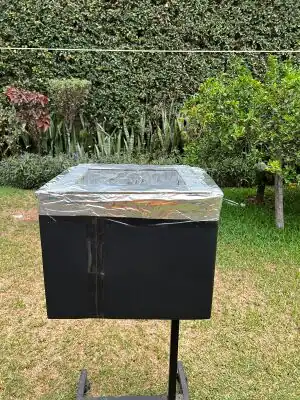 Por otro lado, se forró la parte de adentro de la caja más pequeña con papel aluminio, el elemento más importante en EZ Cook. El papel aluminio es el encargado de absorber y reflejar la radiación solar que entra en la caja. Con la ayuda de la tapa de vidrio, el aluminio hace que el calor se concentre dentro de la caja y eleve las temperaturas permitiendo que se pueda cocinar dentro de esta. También se usó un espejo para reflejar de forma más directa los rayos del sol.