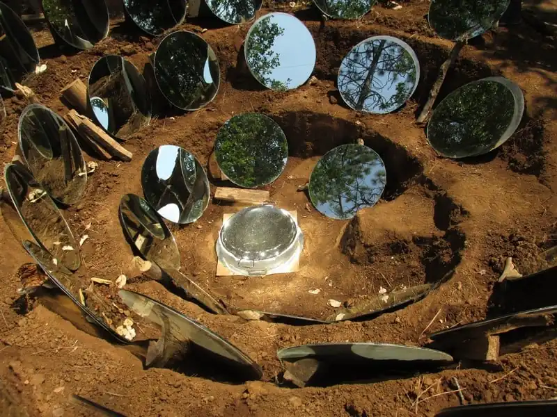 The broken glass mirrors set in a hole in the ground, one might interpret as a poetic reference to an ancient myth that if the pieces of a broken mirror were collected and buried in the ground, an otherwise ensuing spell of bad luck could be vanquished. To the people of a culture predating medical science, water born illness might have been attributed to bad luck or an evil spell. Could it be that this ancient myth is all that remains in mankind's collective memory of a now long forgotten technology of preventive medicine through solar water pasteurization?