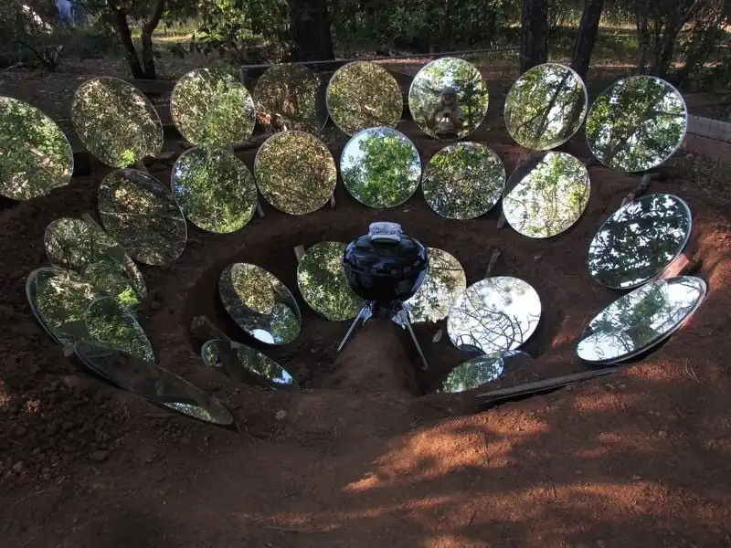 على موقد يعمل بالطاقة الشمسية الأرضية هي منخفضة التكلفة ومنخفضة تصميم الأثر البيئي التي توخاها اورلاندو بارت [1] للاستخدام من قبل الفقراء في مخيمات اللاجئين والقرى في البلدان غير الصناعية الأمم. أنهى ما يقرب من 50 مرآة واحدة قطرها قدم حفرة كبيرة على شكل parabolicly في الأرض التي تصطف مع المواد العاكسة مثل قطع إنقاذها من المرايا والزجاج المكسور، وهذا انعكاس الأغطية يمكن أو مع التمويل، والغذاء الألومنيوم خدمة لوحات جمعت كل يوم من قبل 10:00 و، وتصميم بسيط تستخدم لمدة وثقب (ترابية الشمسية طنجرة). وتتركز أشعة الشمس لقاعدة ثقب حيث يمكن غلي 10 1 حاويات أسود غالون من الماء كل ساعة وتستخدم لإعداد الطعام أو الشرب. (ثقب قطره 7ft، 5ft طهاة عميق 10 غالونات من الأرز / ساعة 11:00 حتي 03:00 في يوم صيف 85f في جنوب وسط ولاية أوريغون.) يتم توزيع لوحات مع وجبات من الطعام المطبوخ والطاقة الشمسية. عندما تنظيفها، ويمكن استخدام لوحات عاكسة كما شخص الاستمالة المرايا التي تم جمعها حتى صباح اليوم التالي للطبخ بالطاقة الشمسية مرة أخرى. بقية لوحات على الأظافر إنقاذها يوضع في جانبي الحفرة.