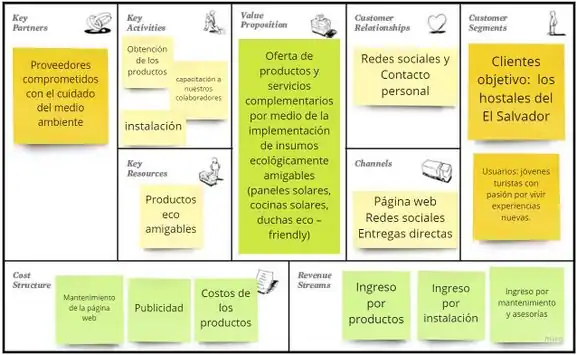 Las principales actividades que realizamos como Eco Eco son la obtención de los 3 productos principales del negocio, la capacitación de nuestros colaboradores para la instalación de los productos y la instalación con un diseño personalizados dentro del hostal. En cuanto a los socios clave nos referimos principalmente a proveedores de nuestros productos que estén comprometidos con el cuidado del medio ambiente y los recursos clave son nuestros productos eco amigables para ayudar al medio ambiente y brindar una experiencia atractiva a nuestros usuarios además de los diseños personalizados que elaboramos para los hostales con el fin de hacer una experiencia inolvidable para los usuarios.