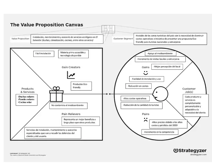 Por todo esto y más, la propuesta de valor de Eco Eco se basa en una oferta de productos y servicios complementarios por medio de la implementación de insumos ecológicamente amigables (paneles solares, cocinas solares, duchas eco – friendly) que permitirán a los hostales ser una atracción para todas las personas que buscan ayudar al planeta tierra y ser de mucho interés para los que quieren tener nuevas experiencias como cocinar con los rayos del sol o tomar un baño en una regadera ecológicamente innovadora. Nuestros clientes objetivo son los hostales del El Salvador y los usuarios de nuestro producto son jóvenes turistas con pasión por vivir experiencias nuevas.