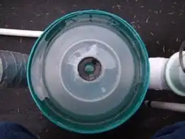 The chamber- The bottom of an old plastic waste bin I salvaged glued to an old large Tupperware I had lying around. The top hole in the chamber has a ¾" rubber gasket glued over it so that I could test different lengths of "up" pipe. Two other holes I made by tracing my 4" pipe onto the side of the bin, drilling small holes on that circle and then finishing the cut with the handsaw in my multi-tool. The down and out pipes are joined to these holes with E600 multi-purpose adhesive.