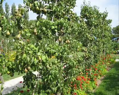 Espalier is a centuries-old horticultural technique to grow fruit trees in a "flat" way, and often against a wall. The main advantage is that space requirements are minimized. This technique is more labor intensive than regular fruit growing and requires more knowledge and care. However, there are also advantages, such as easier fruit picking and simpler netting to protect fruits from birds and other pests. The espalier trees are also highly ornamental. Suitable are apples, pears, apricots, peaches and many others. These trees may be grown in high latitudes against a sunny wall, which will serve as a heat buffer.