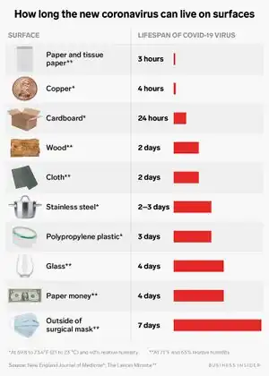 - ↑ Woodward, A. y Gal, S.(7 de abril de 2020). One chart shows how long the coronavirus lives on surfaces like cardboard, plastic, wood, and steel Business Insider. [Revista digital]. Recuperado de: https://www.businessinsider.com/coronavirus-lifespan-on-surfaces-graphic-2020-3
