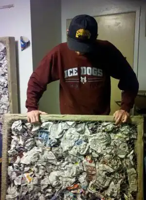 Fill fabric covered panel with filling such as newspaper, dry trash, wool, or (but not limited to) insulation. Then cover with chicken wire and staple secure.... (Photo by Kayla Morris)