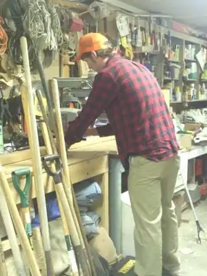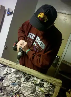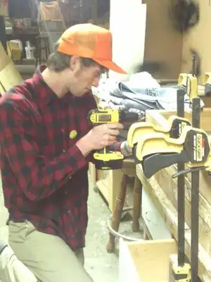 Drilling pilot holes on the joint. One and half inch screws were then used to attach the two sides... (Photo by Amy Gabriel)