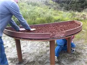 The scale model of the green roof consists of a half-circle table that is six feet in diameter, four feet in radius, and supported by three wooden posts that are secured to concrete blocks buried in the ground. It is installed on the Living Green Interpretive Trail in front of the nature center. Beside the model is an informational sign that explains what green roofs are and the benefits they have.