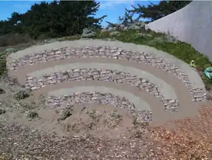 The Builders of the Bay are a part of Cal Poly Humboldt's spring 2012 Engineering 215 course. Engineering 215 Intro to Design The Builders of the Bay consist of Cory McGill, Tyler Lowe, and Jairo Luque Villanueva. The team worked with Friends of the Dunes on building an amphitheater for the Humboldt Coastal Nature Center. Friends of the Dunes is a non-profit organization working to conserve the natural diversity of coastal environments through community supported education and stewardship programs[1]. The Sandy Cove Amphitheater will be used as a main center of teaching and learning at the Humboldt Coastal Nature Center. The Sandy Cove Amphitheater is constructed of stacked slabs of recycled concrete obtained from Kernen Construction. The Sandy Cove Amphitheater is a 137 degree section of a circle with three retaining walls increasing in height and length from the front to the back.