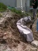 Place landscaping fabric at the back of the wall and backfill sand once mortar has dried.