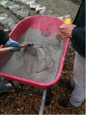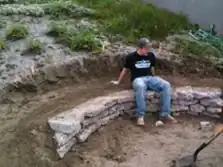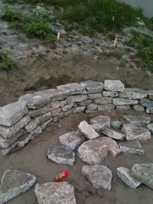 The Sandy Cove Amphitheater begins with three retaining walls constructed of stacked urbanite. The blocks of urbanite composing the three retaining walls are stacked in an offset manner to create a more structurally sound structure. These walls are then backfilled with sand. The first retaining wall is 16 inches high and each level of the amphitheater increases by that measurement as you move up the amphitheater. Each retaining wall is 3 feet wide. Each wall follows the same angle of curvature, which is of 137 degrees from a single, central point that is 5 feet in front of the first wall. The first wall has an arc length of 12 feet, the second wall has an arc length of 19 feet, and the third wall has an arc length of 26 feet. The mortar used in the construction of the amphitheater is concrete.