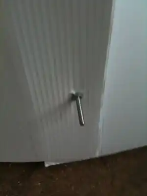 The door has to close like a hatch since the over lapping closes off. We attached a handle to the door and three hooks on the bottom of the sheet to allow for the door to hook shut from the inside or outside.
