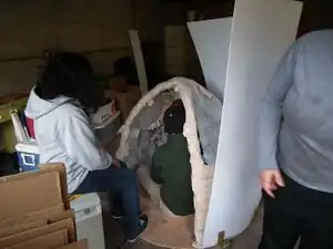 Placing a tub inside the structure allows us to measure how much water can seep through. Putting newspaper throughout the tub allows for detection of water leakage. Using a water hose and a spray nozzle we showered the Bird Cage for 30 minutes. The results were that the edges of the structure got wet from water running down the sides of the corrugated plastic and collecting in a ring on the outside. This would be a good area for the Flock House to make a water collection system most efficient.