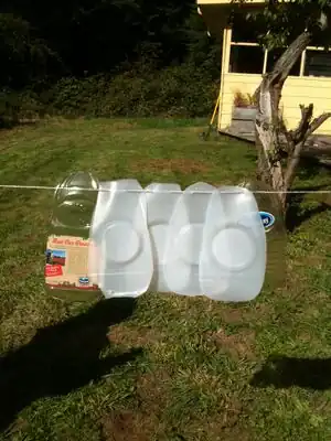 Plastic Plumage is a way of using empty one gallon milk cartons in a new way to cover the windows on the Flock House. The layering of each string of plastic shingles allows for a fluttering effect when wind is present. These shingles provide a moderate amount of water protection while still allowing light and fresh air in.