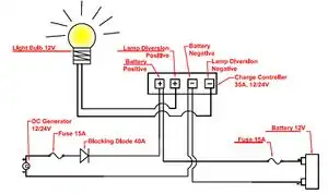 The electronics used in the Geared-Up design are a 36 volt DC motor, a 15 amp fuse and fuse holder, a 40 amp blocking diode, and a 12/24 volt charge controller all wired in series to a 12 volt deep-cycle battery using 12 gauge copper wire. There is also a 12 volt DC light bulb screwed into a light socked which is wired in parallel through the charge controller, used to expend our excess load from the charge controller after charging the battery.