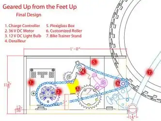 This design is built using an adjustable bicycle trainer stand, a DC motor, a charge controller, BMX bike sprockets, a single-speed BMX chain, a derailleur, and electrical components necessary to power a 12 volt battery all enclosed in a plexiglass box.