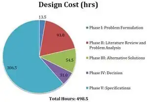 The cost of the design is measured in number of hours, represented in the chart to the right. The chart is distributed by number of hours spend in each phase of the design process. A total of 499 hours were spent in the entire design process.