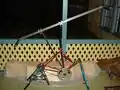 The lever arm consists of a metal bar with an old bicycle handle bar attached to each end. The lever arm rests on a rotating axis that was constructed from the front wheel hub of a bicycle. The arm is held in place by two u-bolts that are inserted through two metal rectangles which are welded onto the center of the lever arm. Through this process and axis of rotation is created for the lever arm. Also attached to the lever arm in an almost identical fashion is the unused pedal from the other side of the bicycle. As the lever arm rotates on its axis it powers the lever bar.