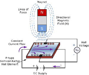 Hall effect sensor works on the principle of magnetic field. It has a thin strip of metal which is given a potential difference across it. Whenever there is magnetic field, the metal strip deflects causing a change in output voltage. the change in voltage output is detected as pulse on arduino. Unlike other transducer hall effect has an advantage, it detects static magnetic field as well ; while other sensor detects change in magnetic field. Over period of time hall effect sensor has found its uses increasingly in varied application viz as an encoder,proximity sensor, rpm, limit switch. Here in our project Hall effect sensor works as a encoder. It has three terminal two for supply and the third one is for signal. The working of hall effect sensor is shown in fig and the image of hall effect sensor