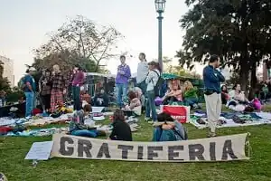 The Really, Really Free Market (RRFM) movement is a horizontally organized collective of individuals who form a temporary market based on an alternative gift economy. The RRFM movement aims to counteract capitalism in a proactive way. It holds as a major goal to build a community based on sharing resources, caring for one another and improving the collective lives of all. Markets often vary in character, but they generally offer both goods and services. Participants bring unneeded items and food, as well as skills and talents such as entertainment or haircuts. A RRFM usually takes place in an open community space such as a public park or community commons.