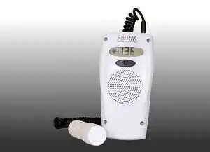 This device measures the infant's heart rate during birth. The design includes an obstetrics ultrasound device connected to the main unit by a cord. It also contains a power-management electronic module, a sound amplifier and a crank for winding up the device. This robust design is meant to withstand wear and tear. Cranking its onboard power-supply charger for one minute provides 10 minutes of operation.