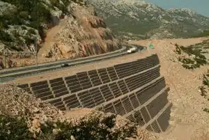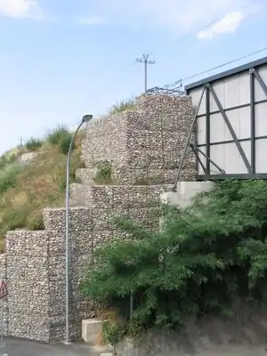 A gabion wall is a retaining wall made of stacked stone-filled gabions tied together with wire. Gabion walls are usually battered (angled back towards the slope), or stepped back with the slope, rather than stacked vertically.